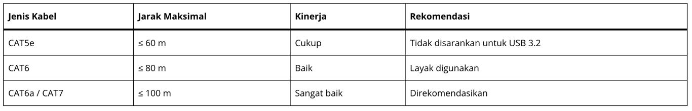 Kualitas kabel sangat memengaruhi performa sinyal. Untuk jarak hingga 100 meter, CAT6a atau CAT7 direkomendasikan karena memiliki pelindung yang lebih baik terhadap gangguan elektromagnetik.