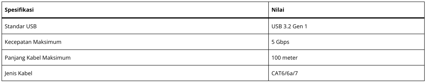 Extender ini mendukung standar USB 3.2 Gen 1, yang mampu mentransfer data hingga 5 gigabit per detik (Gbps). Kecepatan ini cukup untuk mengalirkan data dari kamera PTZ, antarmuka audio, atau perangkat penyimpanan eksternal tanpa jeda.