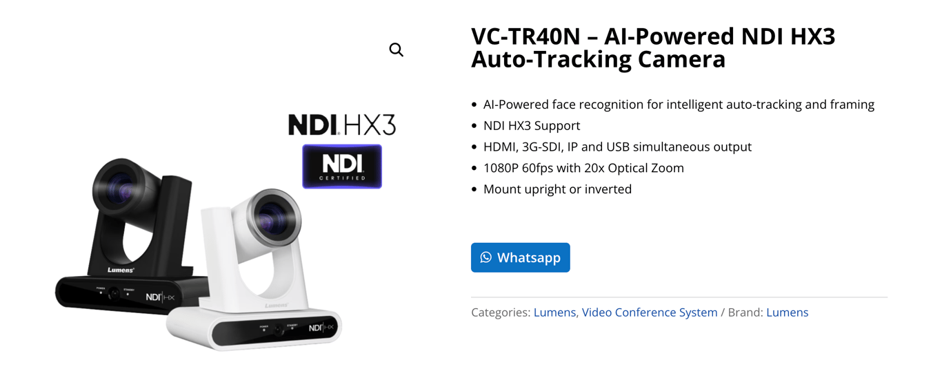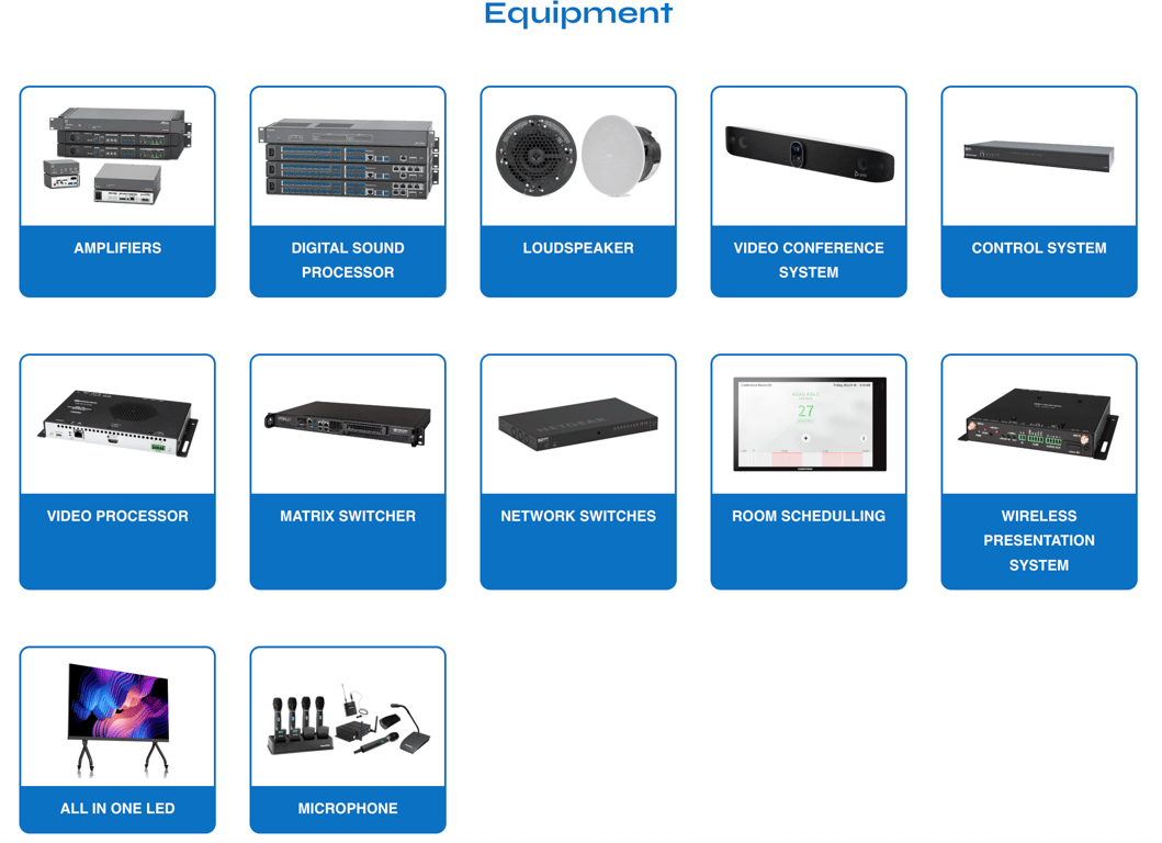 Pada halaman produk ini, pengunjung menemukan berbagai kategori perangkat seperti Video Conference, Amplifiers, Digital Sound Processor, Loudspeaker, Control System, Room Scheduling, All in One LED, Network Switches, dan Wireless Presentation System. Setiap produk mencantumkan spesifikasi lengkap agar pelanggan dapat mempelajari fitur dan fungsi penting sebelum memutuskan pembelian.