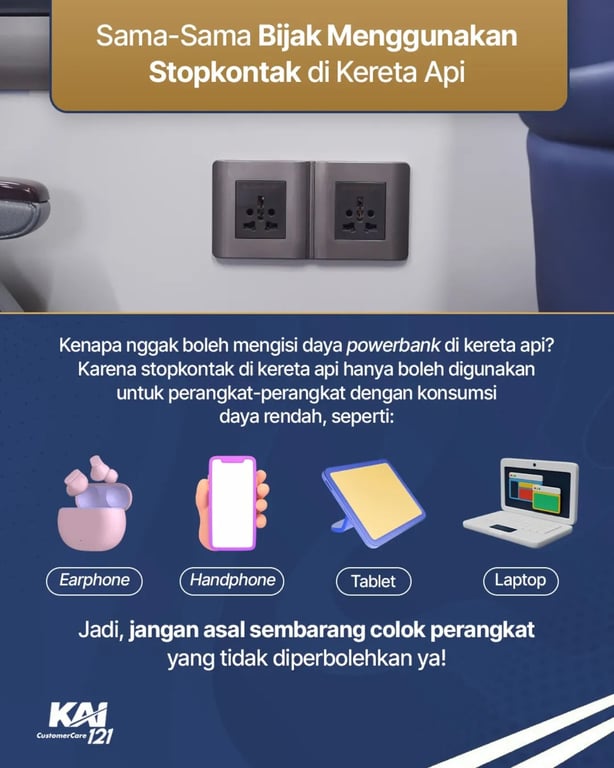 5. Stop kontak di kereta api hanya diperuntukkan bagi perangkat berdaya rendah, seperti earphone, handphone, tablet, dan laptop, bukan untuk mengisi daya power bank atau perangkat elektronik berdaya besar lainnya.