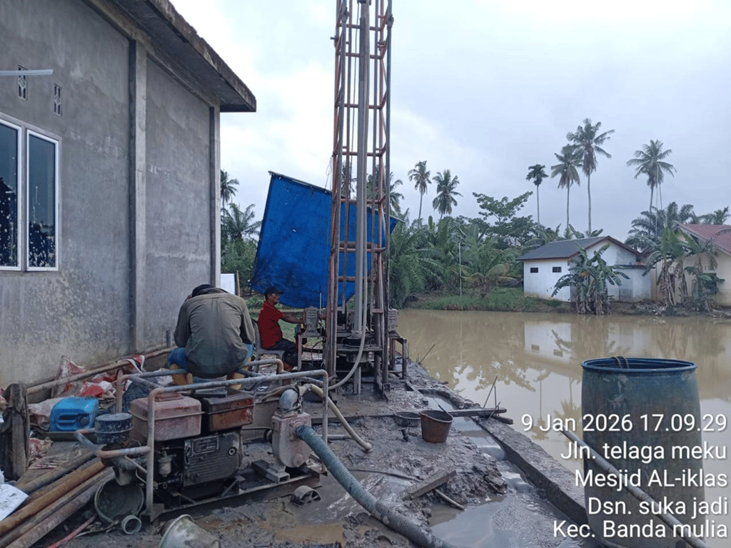 2.    Masjid Al Ikhlas, Gampong Sukajadi, Banda Mulia: Telah mencapai kedalaman 76 meter dengan potensi akuifer yang baik, diproyeksikan menjadi sumber air bagi jamaah dan warga.