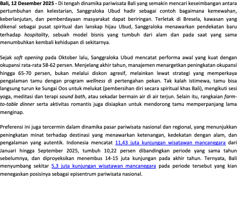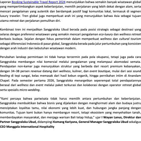Semuanya didukung komitmen ramah lingkungan, mulai dari pengelolaan sampah berkelanjutan hingga kebun organik yang dikelola secara berkelanjutan. Sanggraloka Ubud bukan sekedar resort, melainkan gaya hidup yang memadukan wellness, kemewahan, dan kehangatan Bali.