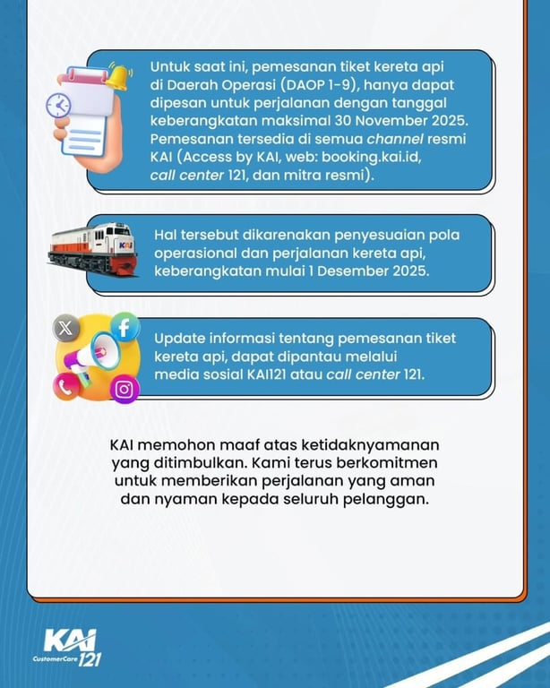 KAI akan segera mengumumkan pembukaan kembali pemesanan tiket Desember setelah proses penyesuaian selesai. KAI Daop 2 Bandung menegaskan komitmennya untuk menjaga keselamatan dan kenyamanan pelanggan sebagai prioritas utama dalam setiap perjalanan kereta api di wilayah operasionalnya.