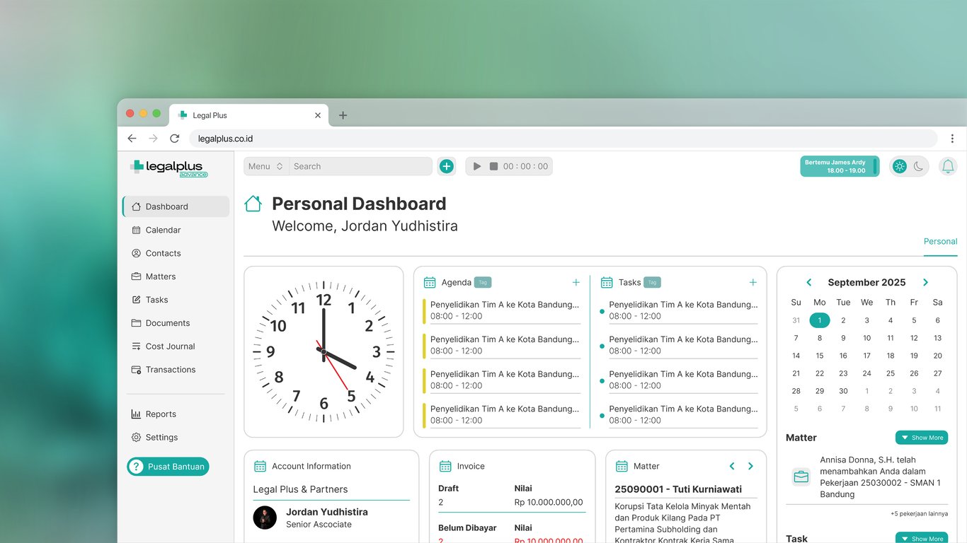 Di tengah banyaknya sektor yang beralih ke sistem digital, sektor hukum masih menghadapi tantangan besar dalam hal adopsi teknologi. Banyak firma hukum masih bergantung pada proses manual, sementara klien menuntut transparansi, kecepatan, dan pembaruan real-time. Menurut James Ardy, CEO Legal Plus, Legal Plus menghadirkan sistem yang bukan hanya membantu advokat bekerja lebih efisien, tetapi juga meningkatkan pengalaman klien.
