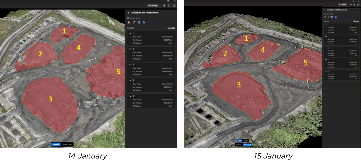 - Pemetaan Georeferensi: menampilkan lokasi stockpile dan perubahan volume secara jelas