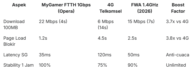 Methodology: Dell XPS i7, Windows 11, MyGamer 1 Gbps Jakarta Selatan vs 4G/FWA simulasi – test setup time, page load 10 situs blokir (Netflix, Reddit), download 100MB, ping SG, stability 1 jam. FTTH boost 3-5x (4-6 Mbps → 15-22 Mbps), latensi 35ms vs FWA 50ms.