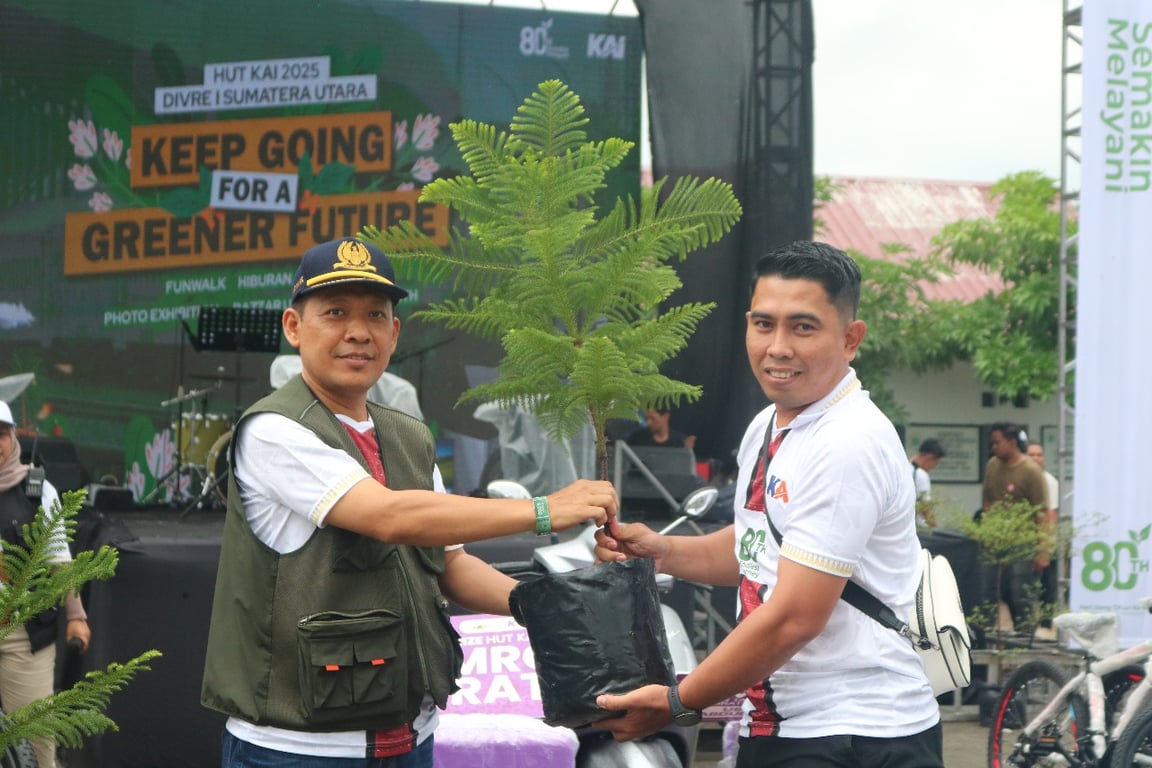 PT Kereta Api Indonesia (Persero) Divisi Regional I Sumatera Utara merayakan Hari Ulang Tahun (HUT) ke-80 dengan menggelar berbagai kegiatan sosial dan lingkungan. Dalam rangkaian acara Family Gathering di Kantor Divre I Sumut, Sabtu (20/9), KAI Sumut menyerahkan bantuan 8 ton beras senilai Rp116,8 juta kepada sejumlah panti asuhan di Kota Medan serta melakukan penanaman bibit pohon di lingkungan kerja.