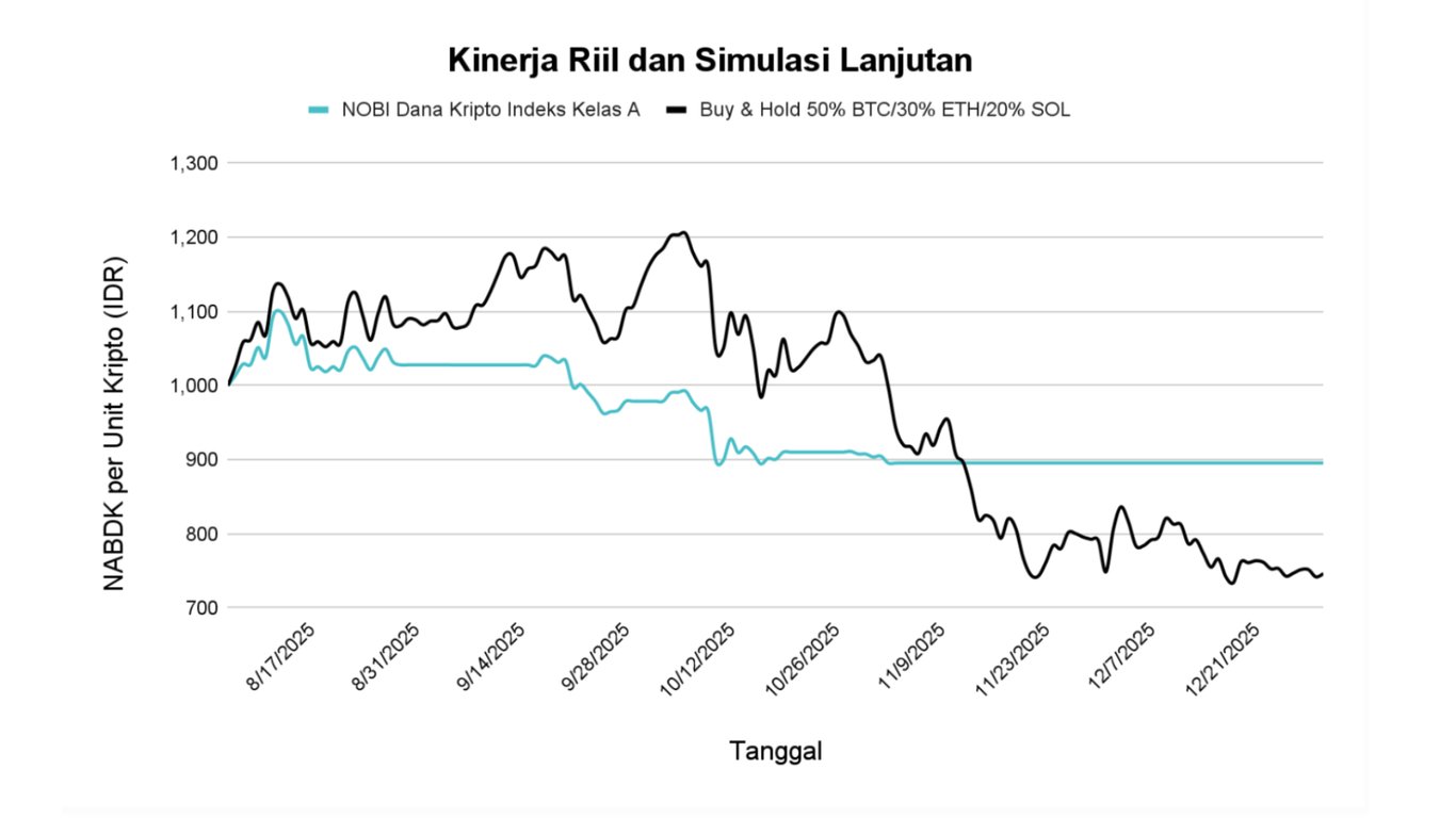 Selama periode operasionalnya dari Agustus hingga November 2025, NOBI Dana Kripto Indeks Kelas A menunjukkan ketangguhan performa di tengah gejolak pasar kripto global yang mengalami koreksi tajam dan gelombang likuidasi besar. Ketika aset kripto utama seperti Bitcoin, Ethereum, dan Solana mengalami penurunan yang dalam, strategi NOBI Dana Kripto Indeks Kelas A berhasil mempertahankan nilai investasi dengan tingkat penurunan yang jauh lebih rendah dan terkendali. Keunggulan ini tercapai berkat langkah taktis pengurangan eksposur saat tren pasar Kripto mulai melemah, sehingga hasil akhirnya terbukti lebih optimal dibandingkan strategi buy & hold.