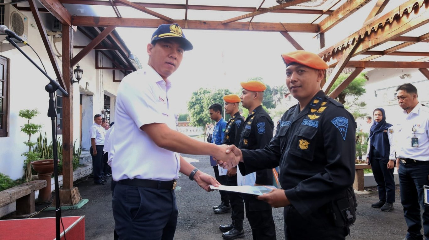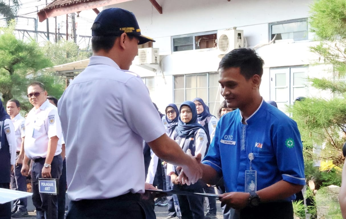 EVP Daop 6 Yogyakarta Bambang Respationo menyerahkan penghargaan secara langsung kepada para petugas dan disaksikan oleh jajaranan manajemen dan para pekerja di halaman Kantor Daop 6 Yogyakarta.
