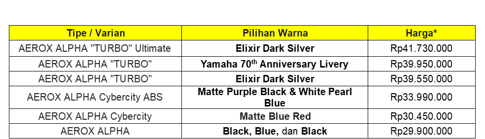 AEROX ALPHA saat ini dipasarkan dengan varian dan warna berikut: