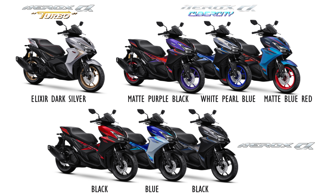 Varian Matte Purple Black dengan kombinasi ungu, hitam, dan merah tampil anti-mainstream dengan suguhan desain velg asimetris berwarna ungu di bagian depan dan merah di bagian belakang. Tak ketinggalan, varian White Pearl Blue dengan kombinasi hitam, biru, dan putih mutiara juga semakin memperkaya pilihan. Bicara soal grafis, line-up Cybercity saat ini tampil dengan highlight tulisan AEROX besar pada bagian boomerang, lengkap dengan guratan garis tipis yang menyelimuti body, yang mengisyaratkan karakter speed.