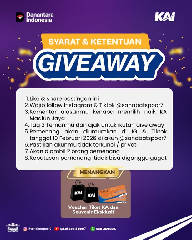 Sebagai bentuk apresiasi dalam merayakan hari jadi yang pertama, KAI Daop 7 Madiun menggelar giveaway menarik bagi para pelanggan setia. Masyarakat berkesempatan mendapatkan Free Voucher Tiket KA dan Souvenir Eksklusif KAI. Adapun Syarat dan Ketentuan informasi lengkap mengenai program ini dapat diakses melalui akun media sosial resmi Daop 7 Madiun di Instagram dan TikTok: @sahabatspoor7