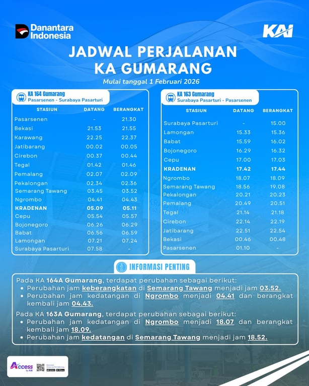 / KA Gumarang Berhenti di Stasiun Kradenan dan KA Matarmaja Berhenti di Stasiun Kedungjati per 1 Februari 2026, KAI Hadirkan Tambahan Alternatif KA bagi Warga Grobogan