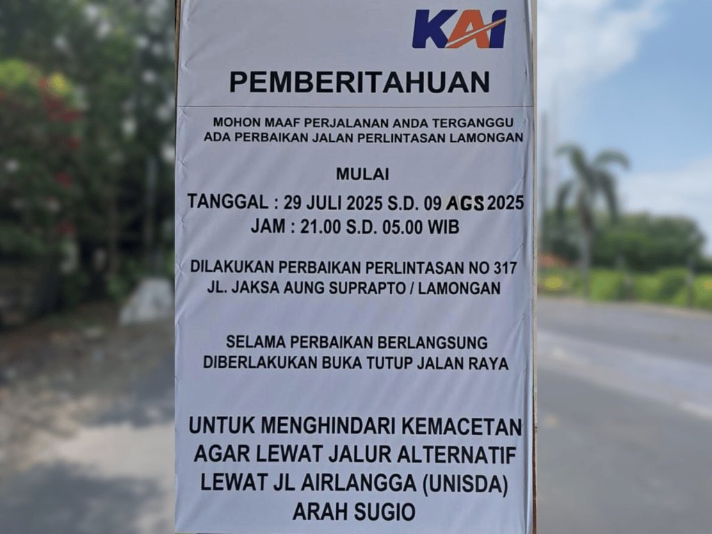 Sebelum proses pekerjaan berlangsung, KAI Daop 8 Surabaya telah berkoordinasi dengan Polres Lamongan dan Dishub Lamongan terkait pengaturan lalu lintas agar dampak terhadap pengguna jalan dapat diminimalkan.