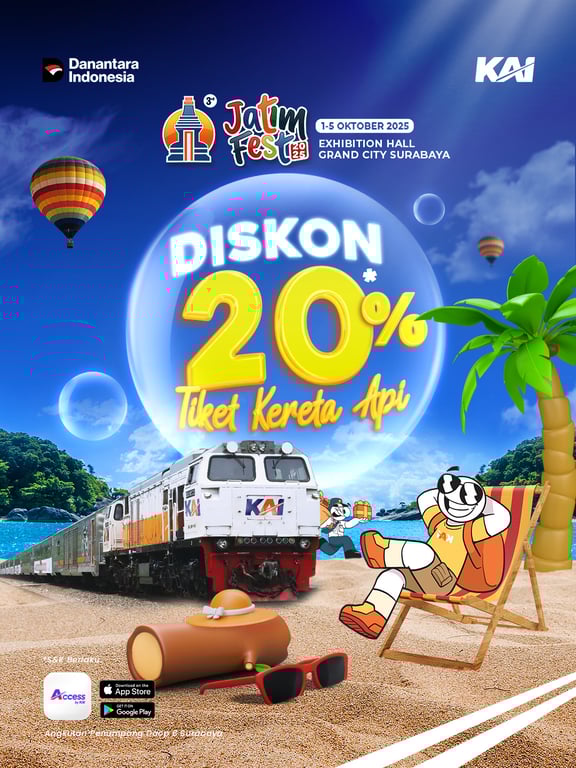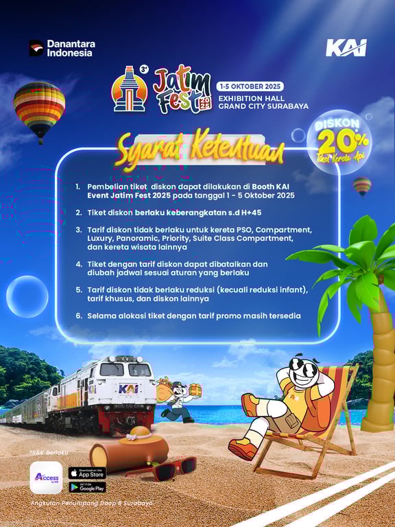 PT Kereta Api Indonesia (Persero) Daerah Operasi 8 Surabaya kembali menghadirkan kejutan spesial bagi masyarakat pecinta perjalanan. Dalam gelaran Jatim Fest 2025 yang berlangsung pada 1–5 Oktober 2025 di Exhibition Hall Grand City Surabaya, KAI memberikan promo menarik berupa diskon 20% tiket kereta api jarak menengah dan jarak jauh.