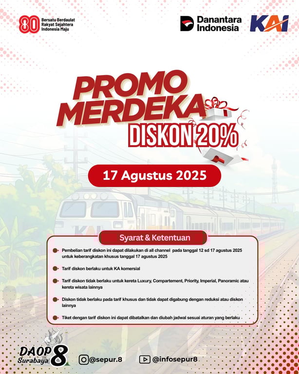 Dalam rangka memperingati Hari Ulang Tahun (HUT) ke-80 Kemerdekaan Republik Indonesia yang jatuh pada 17 Agustus 2025, PT Kereta Api Indonesia (Persero) Daerah Operasi 8 Surabaya menghadirkan program promo spesial berupa diskon 20% untuk pembelian tiket kereta api jarak jauh dan hadirkan dekorasi sentuhan tematik di Stasiun. Program ini dihadirkan untuk menciptakan pengalaman perjalanan yang seru dan berkesan bagi pelanggan kereta api.
