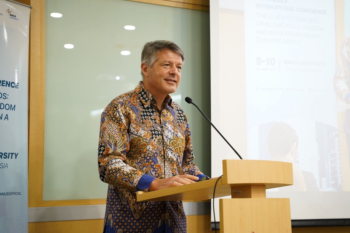 Mengusung tema “The EU at a Crossroads: Upholding Peace, Freedom, and Multilateralism in a Changing World,” konferensi ini menjadi ruang dialog akademik strategis dalam merespons tantangan global, mulai dari konflik geopolitik, tata kelola global, hingga kerja sama ekonomi internasional. Dalam sambutan pembukaannya, Duta Besar Uni Eropa untuk Indonesia, H.E. Denis Chaibi, menegaskan pentingnya kemitraan akademik lintas kawasan antara Uni Eropa dan negara-negara Global South, termasuk Indonesia.