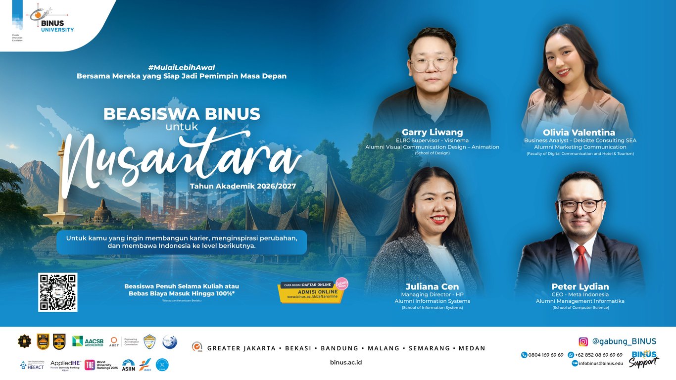 “Beasiswa BINUS untuk Nusantara” membuka peluang bagi calon mahasiswa untuk mendapatkan: Beasiswa penuh selama masa studi, atau Bebas biaya masuk hingga 100%, sesuai syarat dan ketentuan yang berlaku. Program ini juga memiliki profil alumni yang inspiratif dalam dunia profesional seperti Juliana Cen (HP), Garry Liwang (Visinema), Peter Lydian (Meta Indonesia), dan Olivia Valentina (Deloitte) yang membuktikan bahwa pendidikan di BINUS University bukan hanya menghasilkan lulusan, tetapi juga membentuk pemimpin industri masa depan. BINUS University percaya bahwa setiap generasi muda berhak untuk mendapatkan kesempatan dan mewujudkan potensinya.