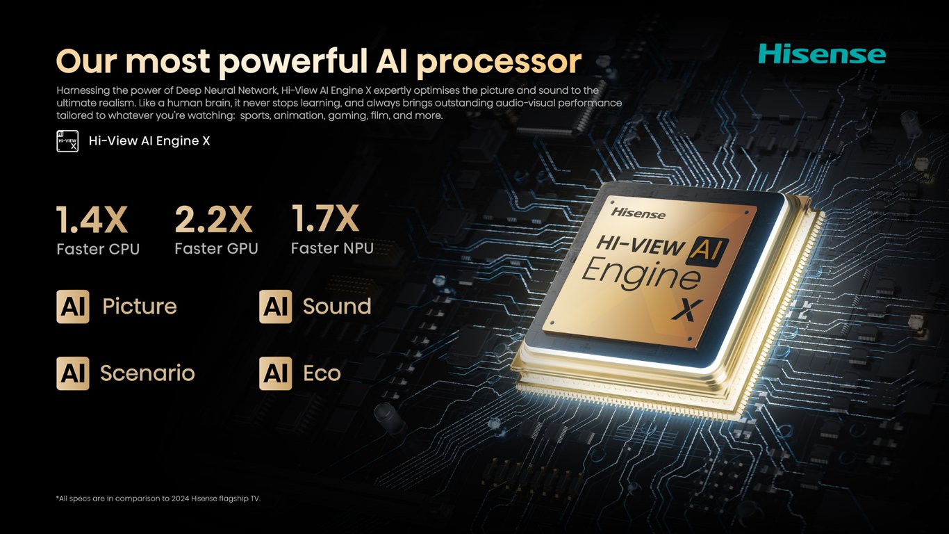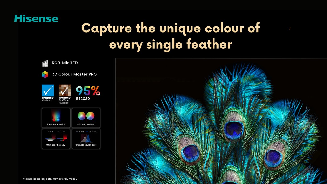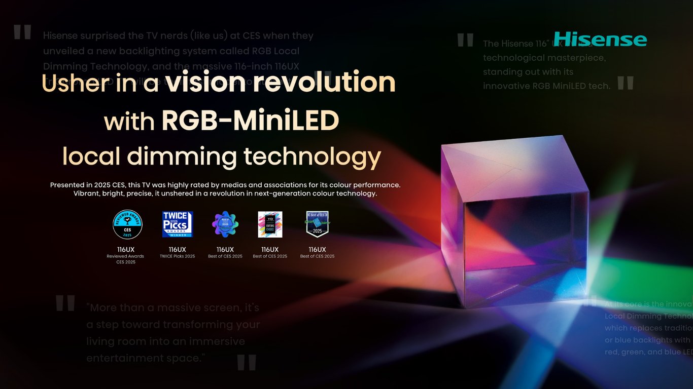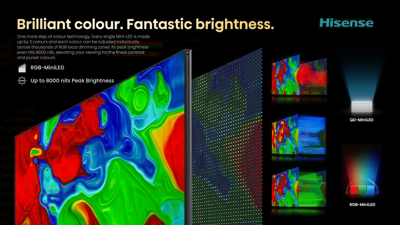 Hisense menjadi pelopor global dalam menghadirkan RGB-MiniLED ke produksi massal, didukung dual-chip inovatif yaitu, RGB-MiniLED Chip untuk kontrol cahaya presisi dan efisiensi tinggi, serta Hi-View AI Engine X sebagai prosesor AI kelas dunia dengan kemampuan penyelarasan cahaya dan warna di ribuan zona local dimming.