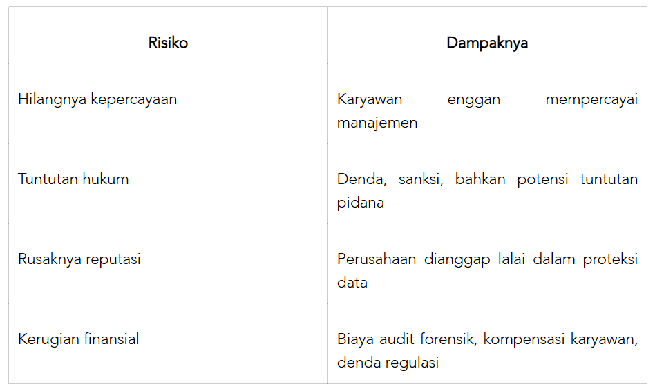 Kalau seseorang bisa mengakses data HR tanpa izin, banyak risiko yang akan terjadi: