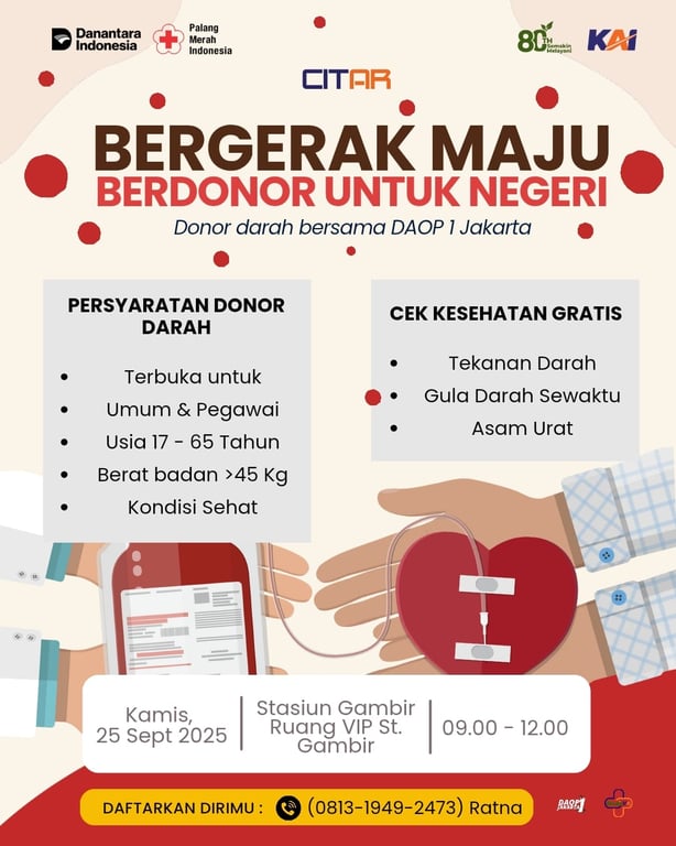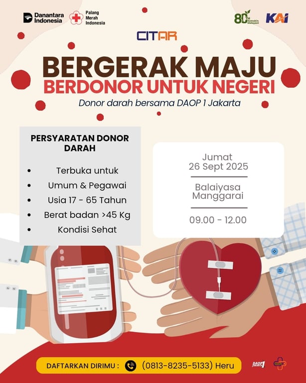 Jakarta, 24 September 2025 – Memperingati HUT ke-80, PT Kereta Api Indonesia (Persero) Daerah Operasi 1 Jakarta (Daop 1 Jakarta) akan menggelar kegiatan Bakti Sosial Donor Darah serentak di berbagai stasiun. Aksi sosial ini menjadi wujud kepedulian KAI terhadap sesama sekaligus kontribusi nyata dalam mendukung ketersediaan stok darah nasional.