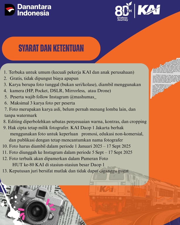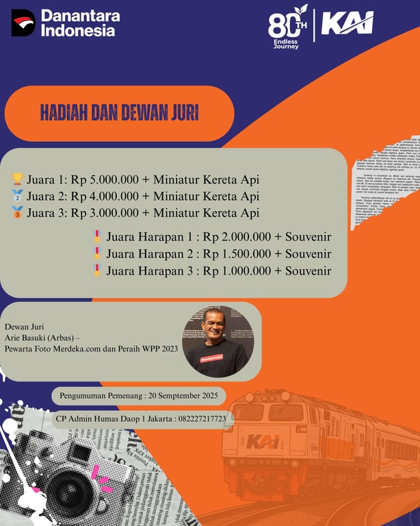 Jakarta, 5 September 2025 - Dalam rangka memperingati HUT ke-80 PT Kereta Api Indonesia (Persero), KAI Daop 1 Jakarta menyelenggarakan lomba fotografi dengan judul “Community Photo Competition” bertemakan “Kereta Api dan Arsitektur”. Perlombaan ini merupakan upaya KAI untuk semakin dekat dengan masyarakat dan komunitas pecinta kereta api.