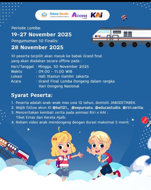 Jakarta, 21 November 2025 — Dalam rangka memperingati Hari Dongeng Nasional, PT Kereta Api Indonesia (Persero) Daerah Operasi 1 Jakarta bekerja sama dengan Educa Studio dan Access by KAI menyelenggarakan Lomba Dongeng Anak bertema “Riri — Tiket Emas dan Kereta Ajaib”. Kegiatan ini dibuka untuk seluruh anak-anak di wilayah Jabodetabek dan dapat diikuti secara gratis.