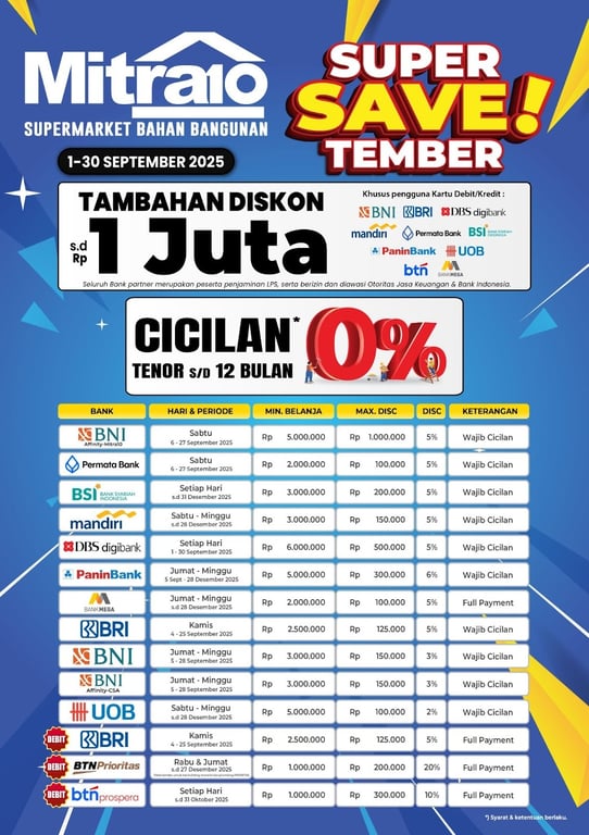 Tidak berhenti di sana, Mitra10 juga menghadirkan keuntungan tambahan melalui promo bank partner. Pelanggan bisa menikmati cicilan 0% hingga 12 bulan, diskon ekstra hingga Rp1 juta, serta cashback hingga Rp1 juta sesuai syarat dan ketentuan yang berlaku. Dengan kombinasi promo ini, belanja di Mitra10 terasa semakin hemat dan memberikan nilai lebih di setiap transaksi.
