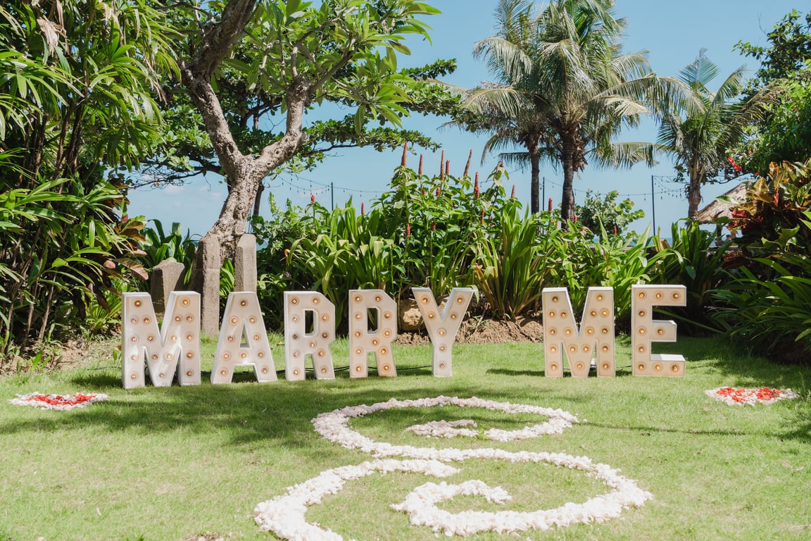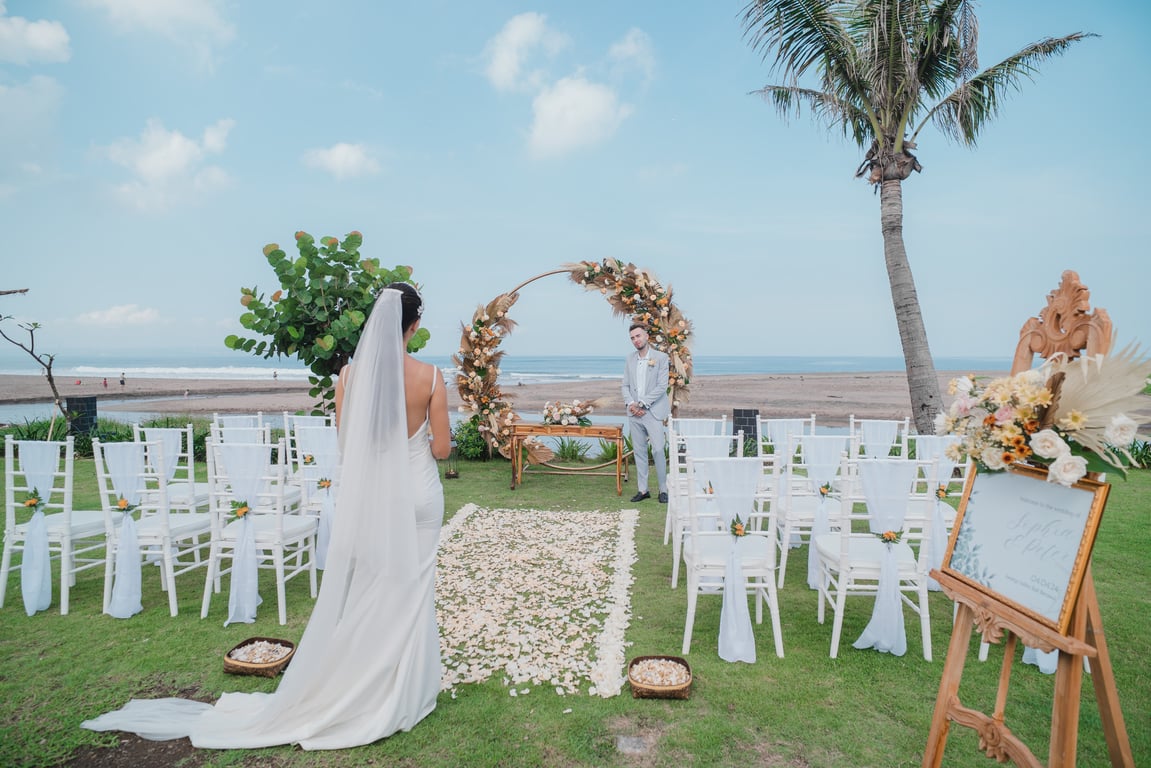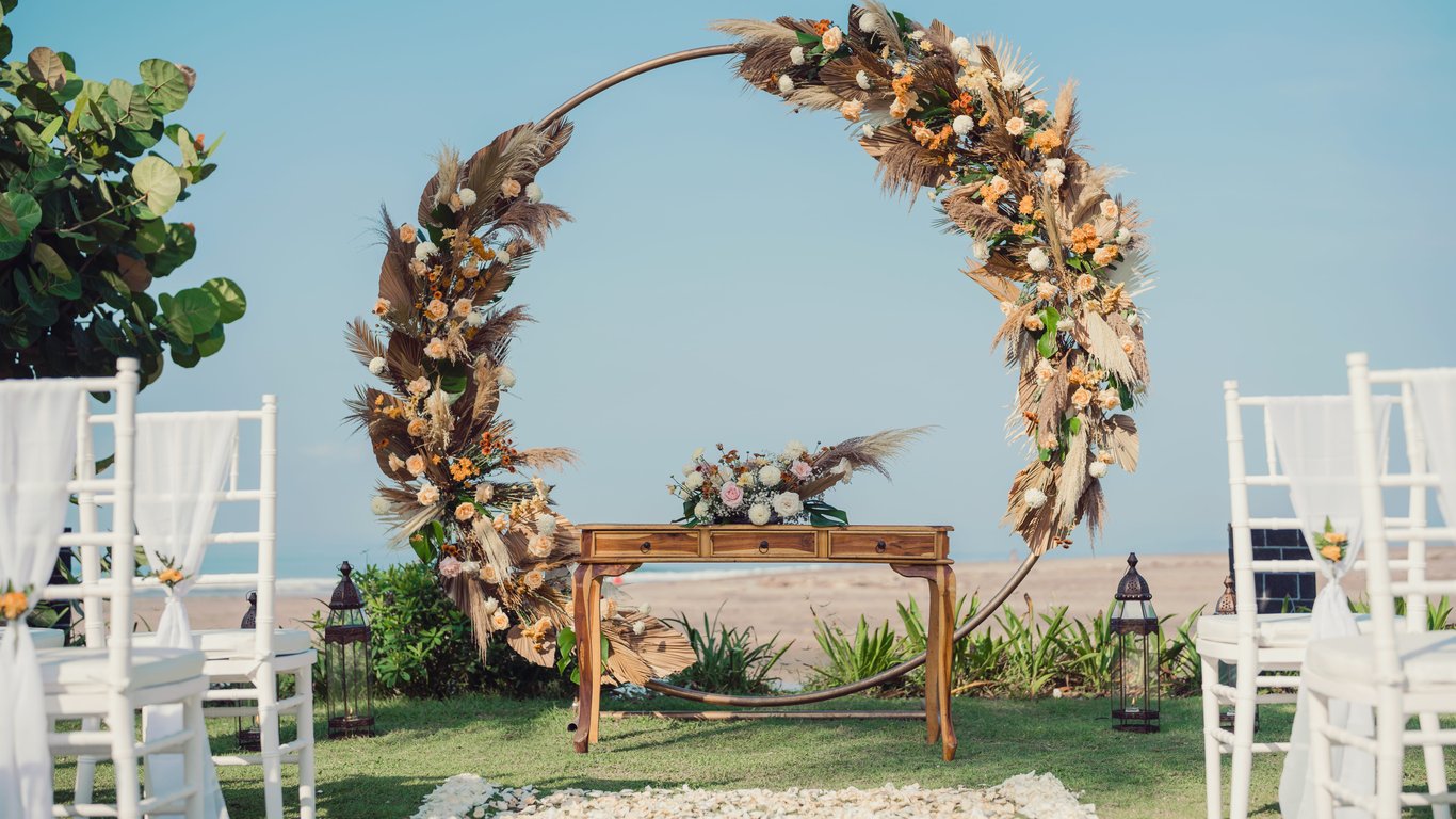 Suasana pernikahan di sini semakin hidup dengan rangkaian bunga tropis. Gerbang bunga, jalur penuh kelopak, hingga dekorasi meja yang elegan menciptakan atmosfer hangat dan romantis. Nuansa flora yang segar berpadu dengan latar laut membuat momen terasa sederhana namun berkesan. Saat matahari terbenam, cahaya jingga menambah keindahan dekorasi, seakan menjadi bingkai alami untuk hari istimewa Anda.