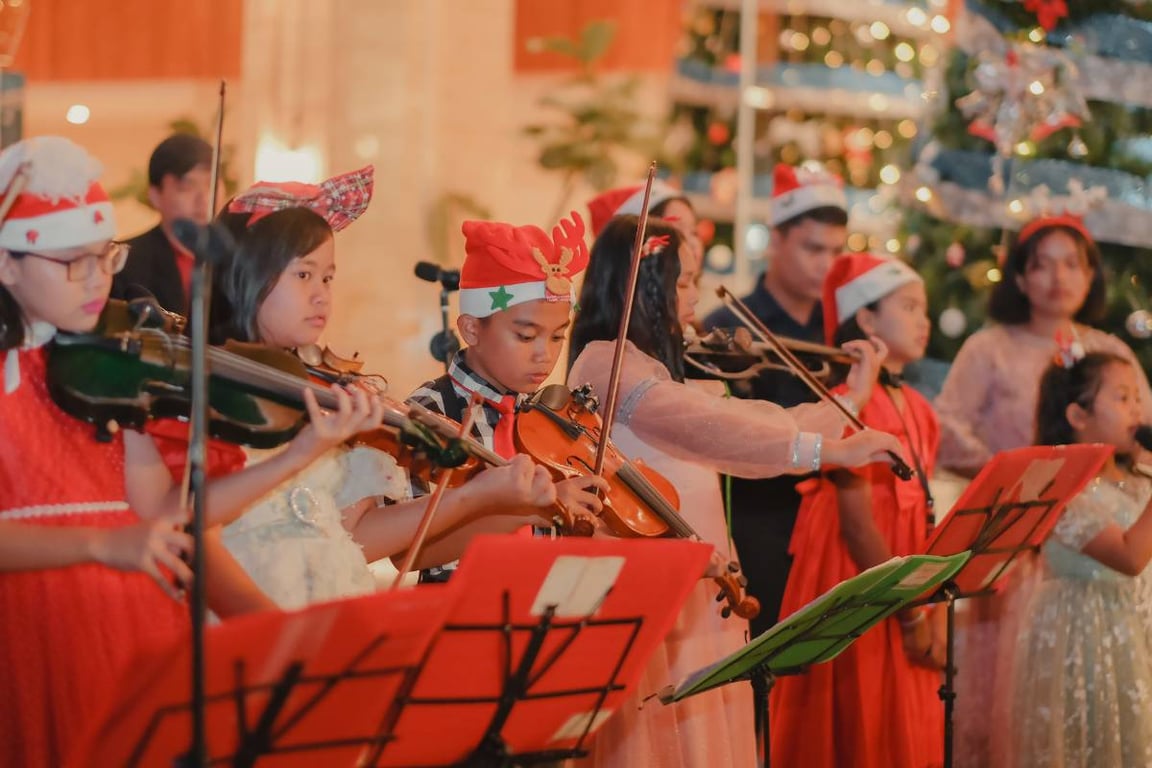 Ketika area tersebut dipenuhi cahaya hangat, penampilan biola anak-anak turut mengalun, menghadirkan harmoni lembut yang sehangat suasana malam itu.