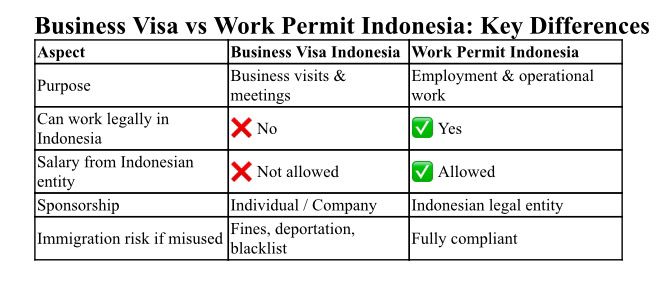 Using a Business Visa Indonesia for operational or technical workAssuming short-term projects do not require a work permitMisinterpreting job titles versus actual job responsibilitiesIncorrect sponsor selection or visa type