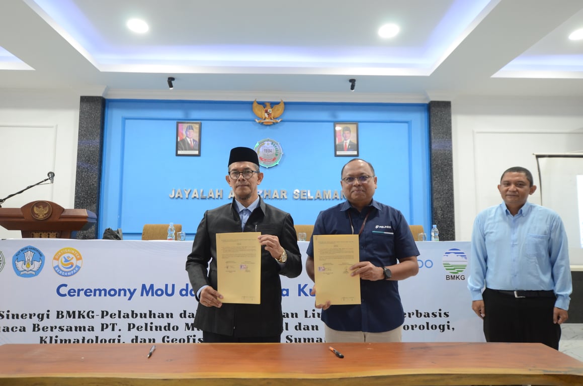 Medan, Januari 2026 - PT Pelindo Multi Terminal (SPMT), Subholding PT Pelabuhan Indonesia (Persero) yang bergerak di bidang operasional terminal nonpetikemas, memperkuat komitmen keberlanjutan dan ketahanan operasional pelabuhan dengan hadir sebagai narasumber utama dalam kegiatan Ceremony MoU dan MoA serta Kuliah Tamu bertajuk “Sinergi BMKG–Pelabuhan dalam Ketahanan Lingkungan Berbasis Cuaca” bersama Badan Meteorologi, Klimatologi, dan Geofisika (BMKG) Sumatera Utara yang diselenggarakan Universitas Al Azhar pada Selasa (20/1). Kegiatan ini menjadi langkah strategis dalam memperkuat kolaborasi lintas sektor untuk menghadapi tantangan perubahan iklim dan risiko hidrometeorologi di kawasan pelabuhan.