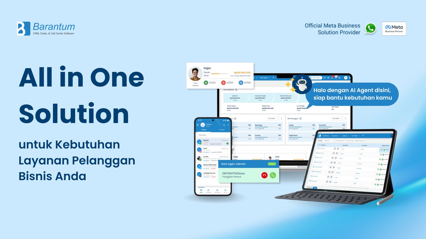 Barantum.com adalah perusahaan penyedia aplikasi CRM, AI Agent, sistem omnichannel chat, call center software dan BSP WhatsApp terkemuka dengan layanan terbaik di Indonesia. Barantum.com cocok digunakan untuk divisi penjualan, pemasaran, pusat panggilan, layanan pelanggan, telemarketing dan telesales.