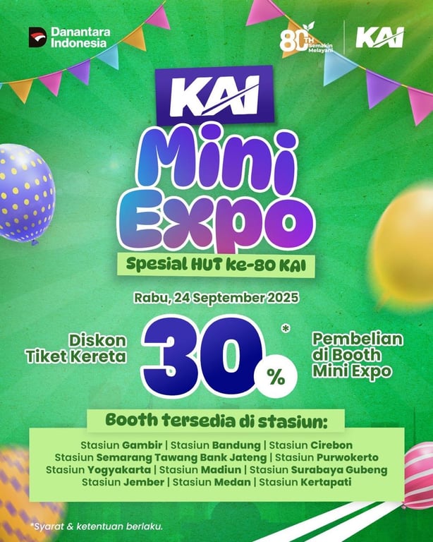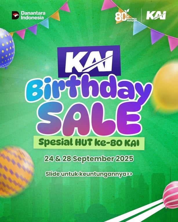 “Delapan puluh tahun adalah perjalanan panjang penuh dinamika, tetapi semangat KAI tetap sama yaitu melayani. Mari rayakan HUT ke-80 bersama kami, dan pantau seluruh promo spesial ini di Access by KAI sesuai jadwal dan ketentuan untuk perjalanan yang semakin berkesan,” pungkas Ixfan.