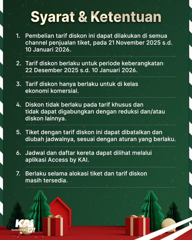 Program diskon dapat dinikmati dengan melakukan pembelian tiket pada 21 November 2025 s.d. 10 Januari 2026, untuk periode keberangkatan 22 Desember 2025 s.d. 10 Januari 2026 melalui seluruh channel resmi penjualan tiket KAI.