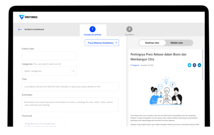 VRITIMES adalah startup asal Jepang yang didirikan oleh Yuiichiro Sasaki & Ferry Bayu pada tahun 2022. Berawal di Indonesia, VRITIMES kemudian berkembang ke Singapura, Malaysia, Filipina, Thailand, dan Vietnam. Kami memiliki visi untuk membuat press release dapat diakses oleh semua orang dengan harga yang terjangkau.
