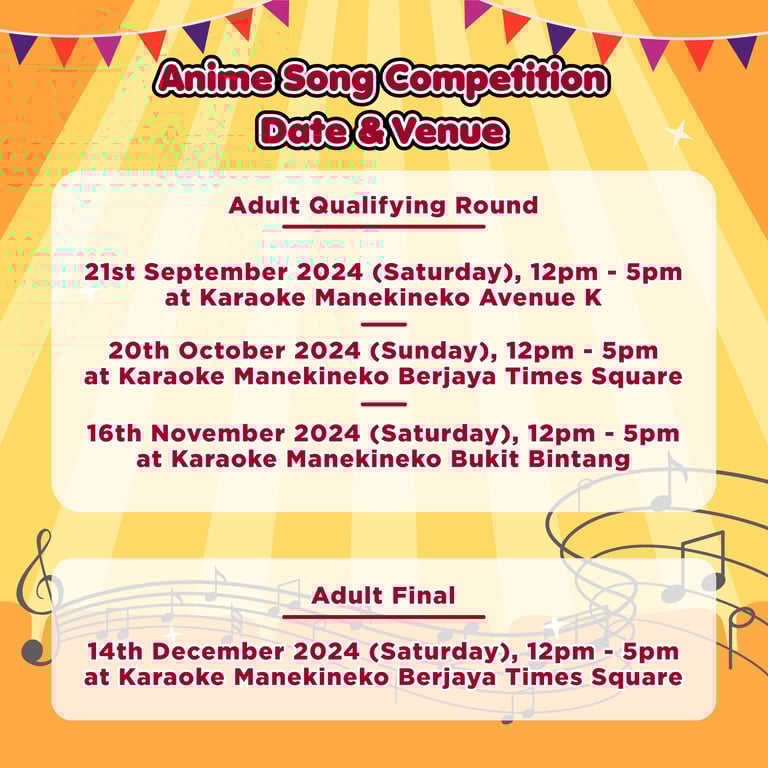Don’t miss this opportunity to belt out your favorite anime tunes and stand a chance to win exciting prizes! Join fellow anime fans and singers for an unforgettable day of music, fun, and friendly competition.