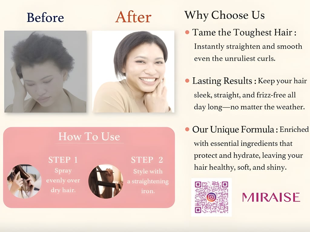 All over the world, people struggle with frizzy, unruly hair and struggle to maintain their desired hair style, particularly in regions with high heat or humidity. This leave-in conditioner has a unique ability to maintain hair shape even in hot and humid environments, strengthening the hair’s internal structure, preventing breakage and split ends, and keeping hair straight and beautiful for a long time.