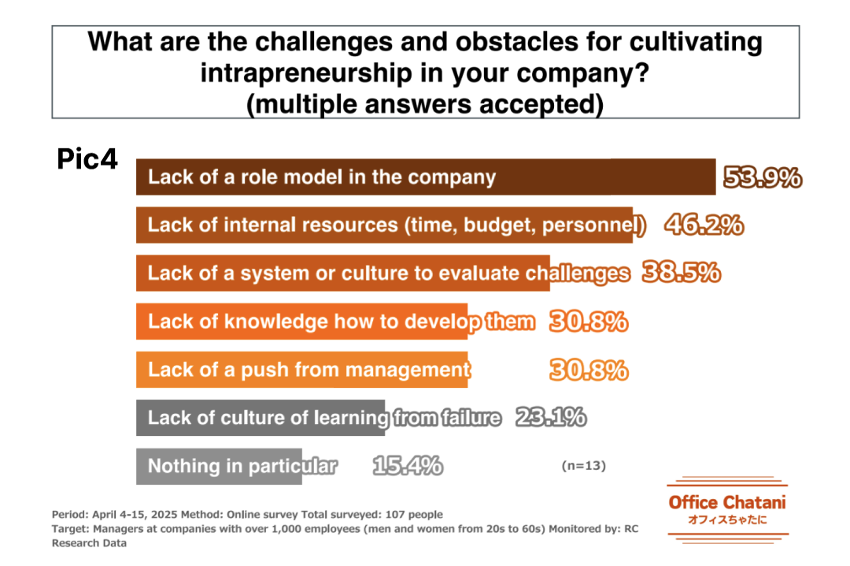 Finally, companies that indicated a lack of intrapreneurs while also indicating they were taking initiatives to develop them were asked “What are the challenges and obstacles for cultivating intrapreneurship in your company?” The top answers were “Lack of a role model in the company” with 53.9%, “Lack of internal resources (time, budget, personnel)” with 46.2%, and “Lack of a system or culture to evaluate challenges” with 38.5%. Based on these results, it has been found that many managers find the lack of a role model within the company to be a major challenge.