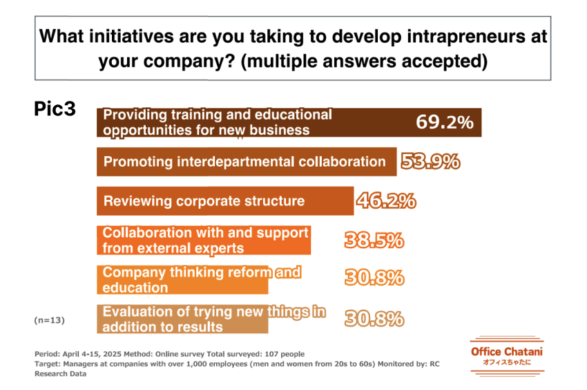 Following this, companies that indicated a lack of intrapreneurs while also indicating they were taking initiatives to develop them were asked “What initiatives are you taking to develop intrapreneurs at your company?” The top answers were “Providing training and educational opportunities for new business” at 69.2%, “Promoting interdepartmental collaboration” at 53.9%, and “Reviewing corporate structure” at 46.2%. Based on these results, it can be said that “providing training and educational opportunities for new business” is the most common initiative for cultivating intrapreneurship.