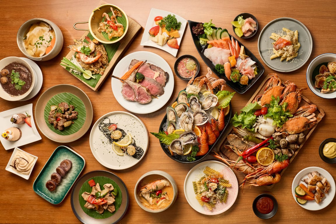 Cook-to-order seafood from the live market zone, unlimited sushi, sashimi and Thai-style sashimi, a wide selection of Western, Thai and international hot dishes, live cooking and carving stations, as well as signature desserts and ice cream to complete the dining experience.