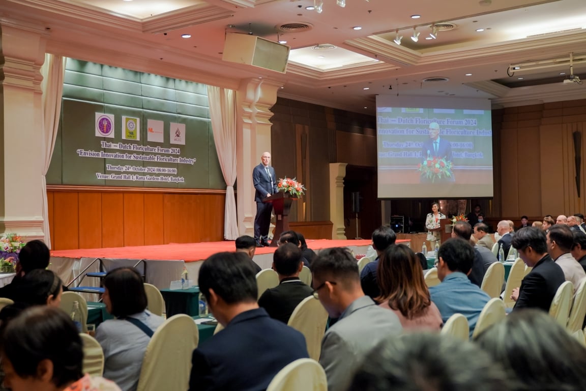 นายแร็มโก ฟัน ไวน์คาร์เดิน (H.E. Mr. Remco van Wijngaarden) เอกอัครราชทูตราชอาณาจักรเนเธอร์แลนด์ประจำราชอาณาจักรไทย กล่าวว่า “ในโลกที่เรายกย่องความสวยงามและความสุขจากดอกไม้ เราต้องตระหนักถึงความท้าทายที่ภาคอุตสาหกรรมไม้ดอกไม้ประดับกำลังเผชิญ เนื่องจากการเปลี่ยนแปลงสภาพภูมิอากาศและผลกระทบต่อสิ่งแวดล้อม วันนี้ เราได้เห็นว่า ประเทศไทยและเนเธอร์แลนด์ ได้นำความรู้ นวัตกรรม และความเชี่ยวชาญมาร่วมแบ่งปันเทคโนโลยีและแนวปฏิบัติที่ดีเพื่อความยั่งยืน ความร่วมมือนี้เป็นกุญแจสำคัญในการเสริมสร้างความแข็งแกร่งและยั่งยืนให้กับอุตสาหกรรมไม้ดอกไม้ประดับเพื่ออนาคต ผมมั่นใจว่า เราจะสามารถร่วมกันสร้างอนาคตที่สดใสและเป็นมิตรต่อสิ่งแวดล้อมยิ่งขึ้น ขอแสดงความยินดีกับทุกท่านที่ได้เป็นส่วนหนึ่งของงาน Thai – Dutch Floriculture Forum 2024 ซึ่งจัดขึ้นในโอกาสครบรอบ 420 ปี ความสัมพันธ์ไทย – เนเธอร์แลนด์ และ Dutch Orange Green Weeks 2024 เพื่อเฉลิมฉลองความมุ่งมั่นร่วมกันของเราต่อการสร้างสรรค์นวัตกรรมและความยั่งยืนให้กับอุตสาหกรรมเกษตรต่อไป”